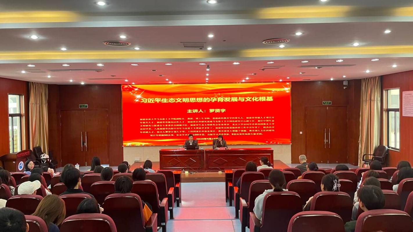 习近平生态文明思想是习近平新时代中国特色社会主义思想的重要组成部分,是党领导生态文明建设实践成就和宝贵经验提炼升华的重大理论创新成果,为筑牢中华民族伟大复兴绿色根基、实现中华民族永续发展提供了根本指引。为进一步深入学习把握习近平生态文明思想的丰富内涵、科学体系和文化根基,深刻把握生态文明建设与正确政绩观的内在统一关系,切实把绿色发展理念融入政绩导向与育人实践,4月16日,我校邀请福建农林大学马克思主义学院副院长罗贤宇教授在笃行楼四楼报告厅开展题为 《习近平生态文明思想的孕育发展与文化根基》的专题讲座,马院全体教师及学生代表参加。