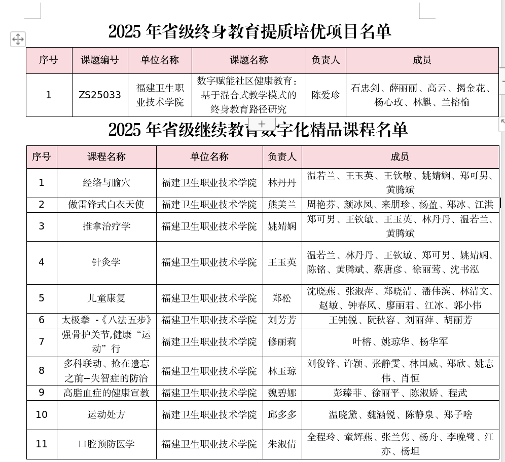 近日,福建省教育厅公布2025年省级终身教育重点项目名单,我校凭借扎实的教学积淀与创新的课程建设,共有 12项成果成功入选。