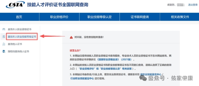 2.个人用户实名登录后,可查询本网站目前归集的本人名下所有技能类职业资格证书和职业技能等级证书。查询结果显示证书的完整信息。