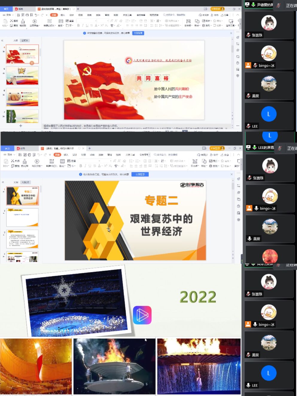尹德爱、李宝珠、黄玲云分别就《不断推进全体人民共同富裕》《艰难复苏中的世界经济》《打好实现碳达峰碳中和这场硬仗》三个专题作主旨备课。尹德爱通过阐释共同富裕的科学内涵和实践途径,澄清模糊认识,引导学生树立“幸福生活都是奋斗出来的,共同富裕要靠勤劳智慧来创造”的理念,反对不劳而获、“躺平主义”;李宝珠以“后疫情时代”对我国经济的影响作为导入设计,结合最新的时政要闻充分将最新资讯与课程内容相结合,增强了理论的说服力;黄玲云通过详实、直观的数据资料分析该主题的教学内容和内在逻辑,以贴近学生实际的案例,从全局性、战略性的高度帮助学生理解中国必须实现“碳达峰”“碳中和”战略目标。