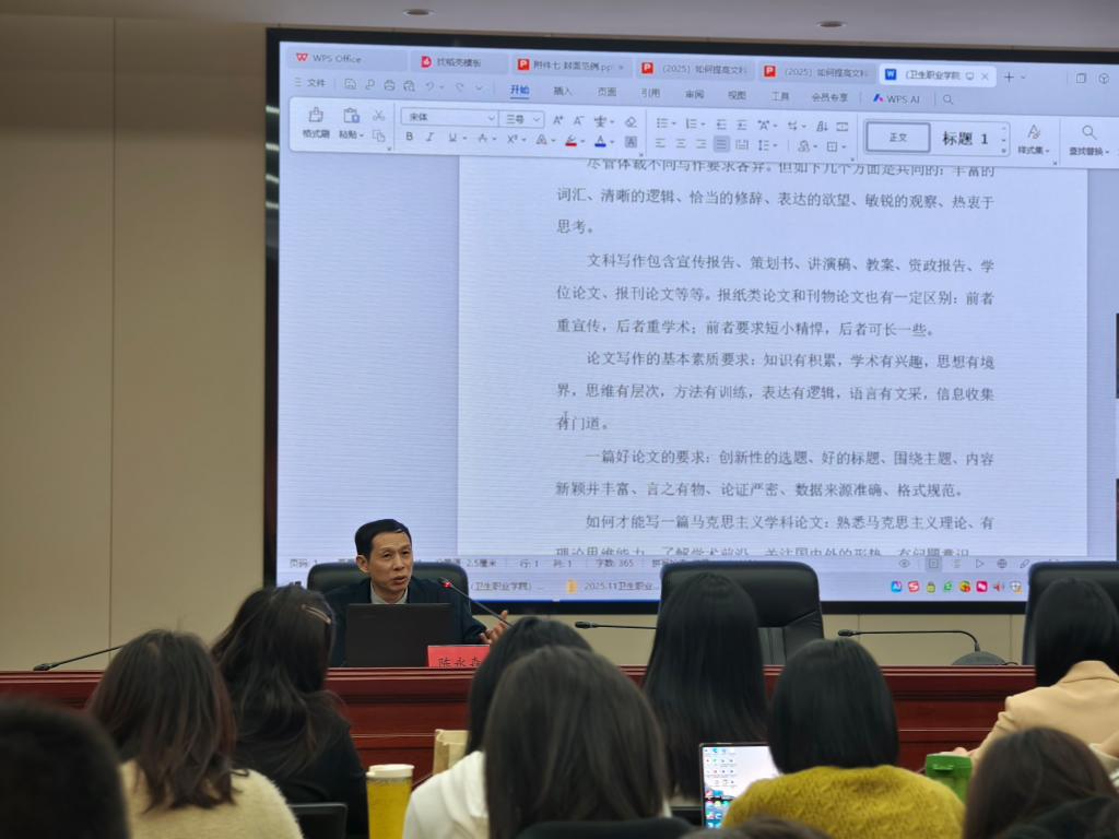 为精准传递科研价值、系统提升教师学术写作能力、凸显研究创新特质、规范科研成果呈现。11月20日,马克思主义学院邀请福建师范大学马克思主义学院教授、博士生导师,《福建师范大学学报(哲学社会科学版)》主编陈永森在厚德楼六楼会议室开展《人类卫生健康共同体的生成逻辑与实现路径研究——如何写一篇符合核心刊物要求的好论文》的专题讲座。马克思主义学院副院长杨盈主持,马克思主义学院全体专兼课教师参加。