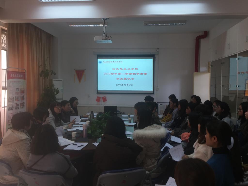 为持续贯彻落实习近平总书记在学校思想政治理论课教师座谈会上的重要讲话精神,持续改进思想政治理论课教学实效性,立好课堂主渠道,马克思主义学院(以下简称“马院”)于2019年12月4日在107会议室召开2019学年第一学期教学质量学生座谈会,校督导室主任、马院各教研室主任、马院办公室主任及各系部30名学生代表参会,会议由马院院长熊美兰主持。
