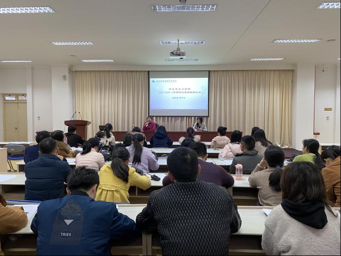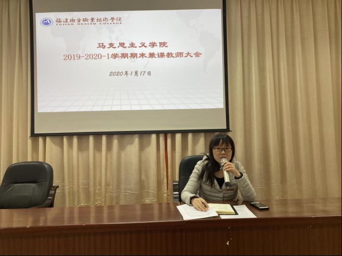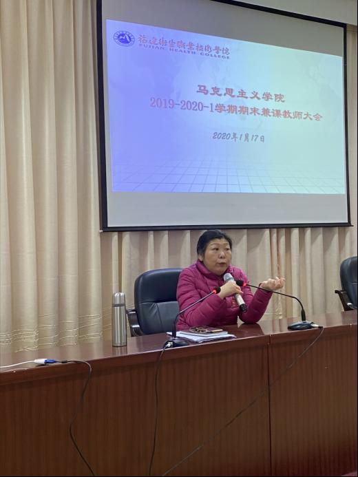 为全面提升教师教学质量,深入贯彻落实学校思想政治理论课教师座谈会、全国教育大会、全国高校思想政治工作会议精神,贯彻落实中共中央办公厅、国务院办公厅《关于深化新时代学校思想政治理论课改革创新的若干意见》,办好新时代高职高专思想政治理论课,用习近平新时代中国特色社会主义思想铸魂育人,发挥好思政课在高职高专院校立德树人根本任务的关键课程作用,抓好思政课教师队伍建设,马克思主义学院(以下简称“马院”)于2020年1月17日在行政楼六楼会议室召开马院2019-2020-1学期期末兼课教师大会,全体兼课教师参与本次会议,马院院长熊美兰主持。