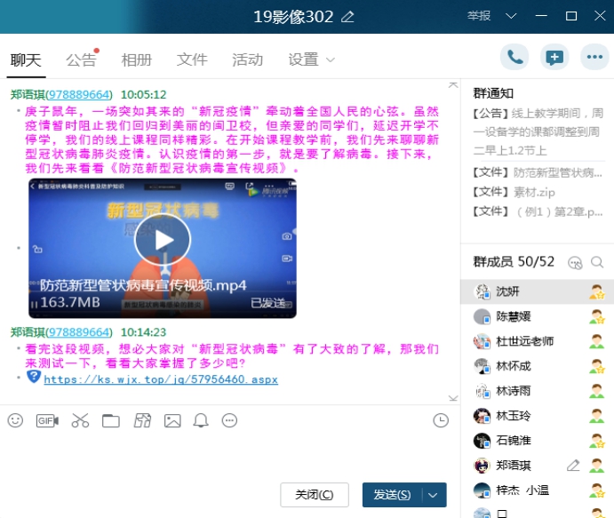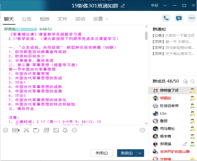 2020年2月17日,根据教育部、省教育厅发布的“停教不学”及学院疫情防控相关文件精神,军事理论课郑语琪老师利用QQ和超星“学习通”APP等平台线上授课《防范新型冠状病毒宣传视频》,运用网络教学手段,把疫情防控课程作为开学第一课的内容。