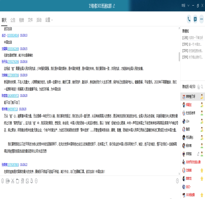教学过程中,老师和同学们互动讨论,互相鼓励。教学效果显著,同学们学习该课程非常积极,既有文字,也有图片,还有专家视频,为同学们学习病毒防护知识,科学应对疫情提供了很好的保障。同时大家给湖北的同学加油打气,让人感动。让我们为奋战在一线的医护人员加油!为武汉加油!为中国加油!