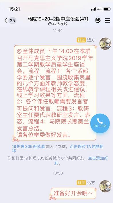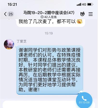 会议首先由各个系学生代表就本专业学生对于思想政治理论课教师在疫情期间线上教学态度、线上授课内容、教学方法等方面的情况进行反馈并对于教师教学内容、教学态度以及教学方法提出改进建议与反馈。在认真听取大家的发言后,概论教研室主任胡济林表示,首先,这个学期我们在抗击疫情的特殊背景下开展教学活动,这是一个很大的创新,在这里,特别感谢各位学习委员的辛勤劳动,因为网络教学对同学的管理很不容易,学习委员发挥很好的作用。其次,听到同学们对老师的评价总体是积极向上的,对于同学们提出的意见和建议我们将反馈给老师,督促教师提出整改和解决。最后,临近期末,希望大家继续做好期末工作,在复习等方面有什么问题,及时跟老师沟通,做好期末复习工作。形势与政策教研室主任丁爱芝表示,感谢同学们对形势与政策课授课老师们的认可。在特殊疫情时期,本课程总体教学情况良好,针对同学们提出的建议,本教研室的老师们还需要再接再厉,在后期教学中根据实际情况适当增加课堂互动环节,为同学们更好地学习提供帮助。军事理论与就业指导教研室代表教师张崇飞表示老师们将针对同学提出的教学建议认真整改,改善线上教学存在的问题,努力提升整体教学质量。