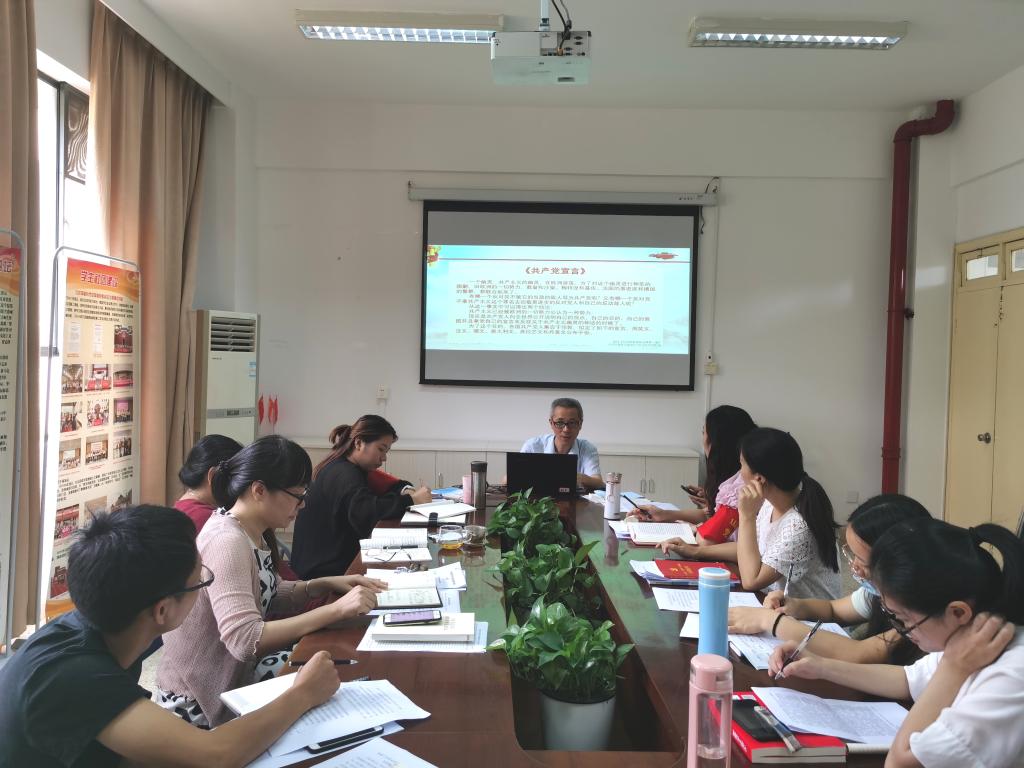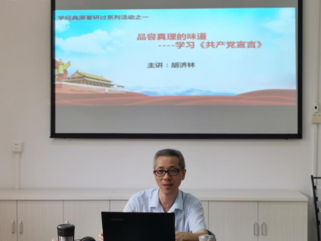 活动中,胡济林老师首先阐述了自己为什么选择《共产党宣言》进行研读,他指出,《共产党宣言》是国际共产主义运动的第一个纲领性文件,第一次比较系统地阐明了马克思主义的基本理论;接着,他带领大家一起学习、研讨《共产党宣言》;最后,他为我们分享了他的学习体会。他说到,在日常的教育教学中,我们要坚持实事求是、求真求实的科学态度,保持与时俱进的观点,加强教师之间的团结合作,造就一支政治强、业务精的思政教师队伍。