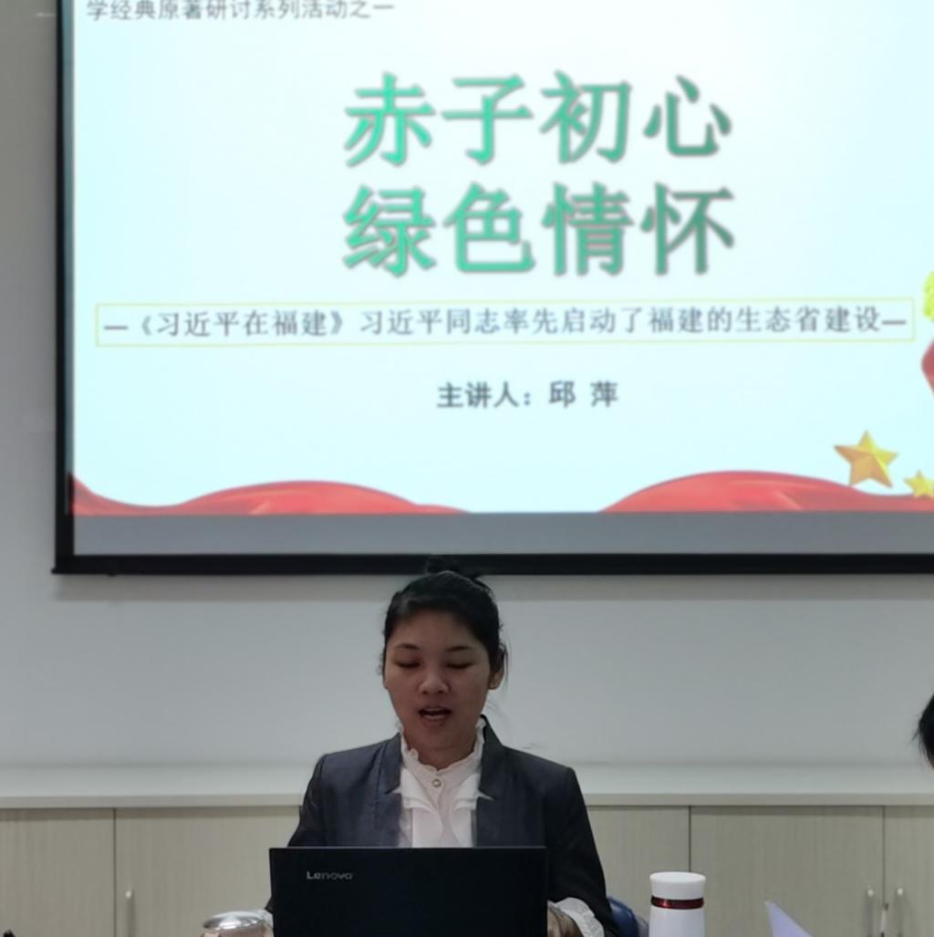 活动中,邱萍老师首先阐述了自己为什么选择《习近平在福建》进行研读,她谈到,新冠肺炎疫情让我们更加清晰的认识到,人与自然是命运共同体。接着,她从习近平生态文明思想的理论渊源、内在逻辑、福建探索、教学建议等方面进行研读。最后,她为我们分享了她对于习近平生态文明思想的见解。她说道,生态环境没有替代品,用之不觉,失之难存。习近平生态文明思想集中体现了我们党对人类文明发展规律的深刻认识,鲜明宣示了担当历史重任的决心。