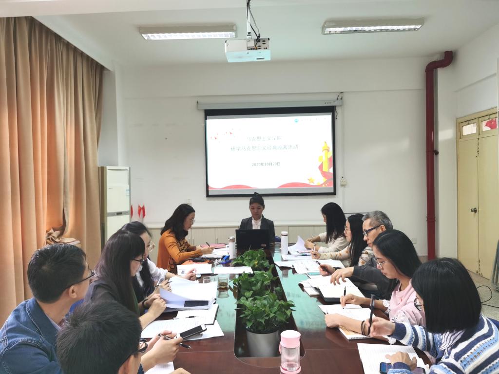 2020年10月29日下午,马克思主义学院全体思政教师在会议室举行了第五次马克思主义经典原著研学活动,此次活动由马克思主义学院院长熊美兰主持,邱萍老师主讲。