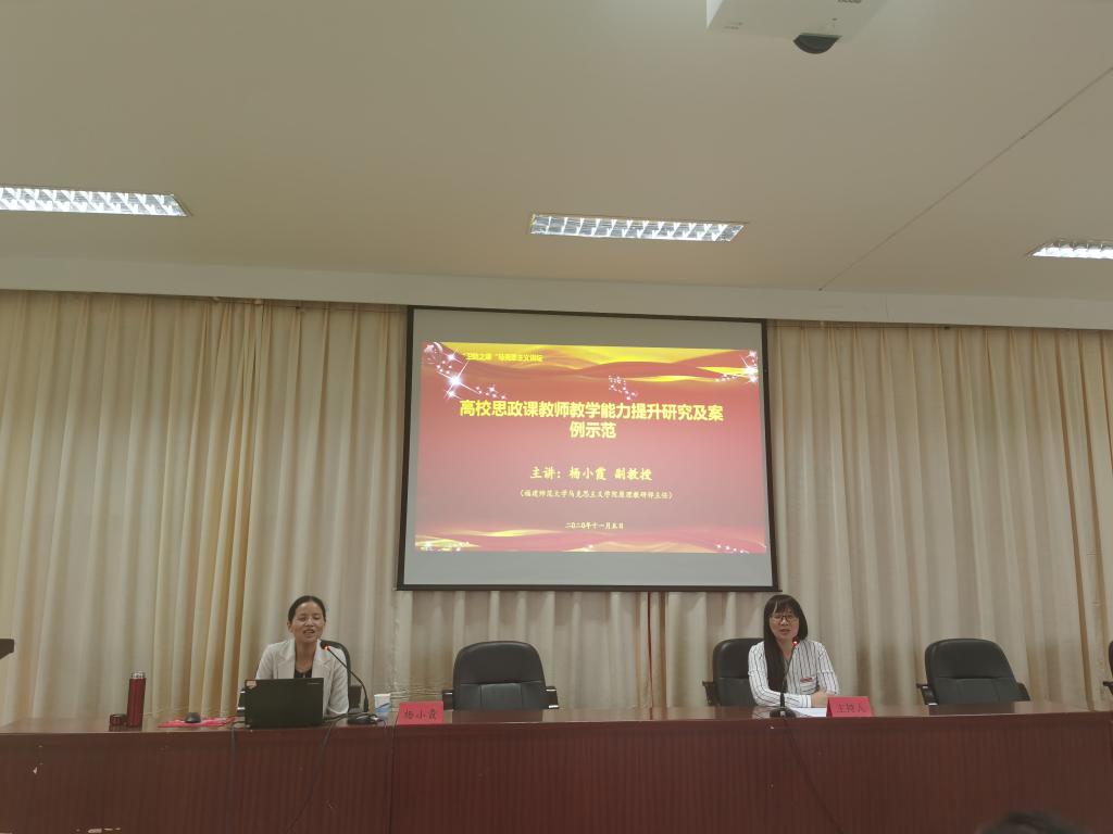百年大计,教育为本。教育大计,教师为本。为强化教师教学技能,提升教师教育教学能力,2020年11月5日,马克思主义讲坛特别邀请福建师范大学马克思主义学院杨小霞副教授为马院全体专兼职老师做《高校思政课教师教学能力提升研究及案例示范》的专题讲座。讲座由马克思主义学院院长熊美兰主持。