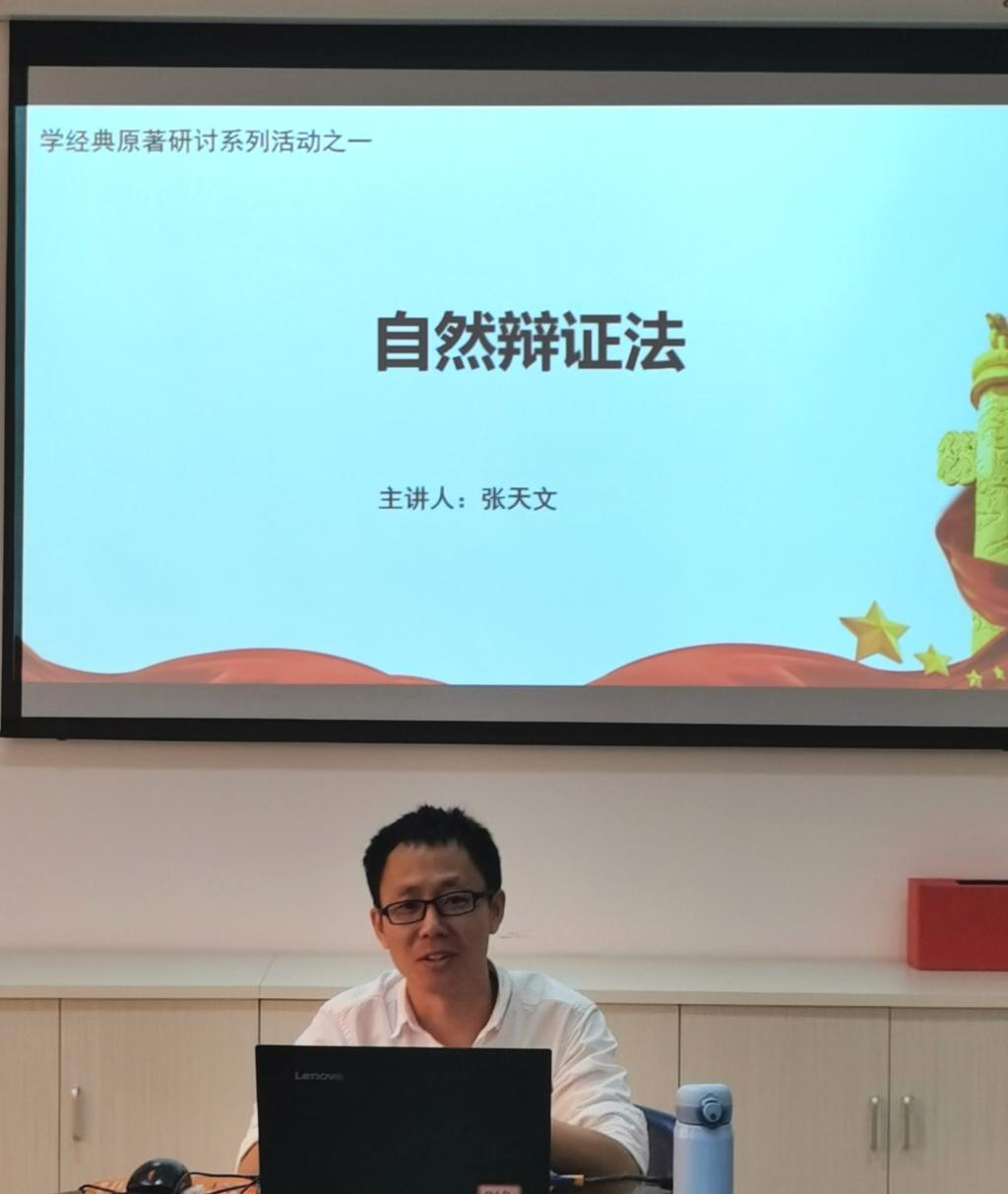 活动中,张天文老师首先谈到,恩格斯的《自然辩证法》是唯物辩证法的发展史上的一个重要的里程碑,在马克思主义的发展史上有着特殊的地位。接着,他从该著作的背景、理论地位、主要内容和观点以及该著作的影响和当代价值等方面进行研读。最后,他结合习近平总书记系列重要讲话精神,阐述习近平总书记是如何善于把辩证思维用于治国理政实践中。