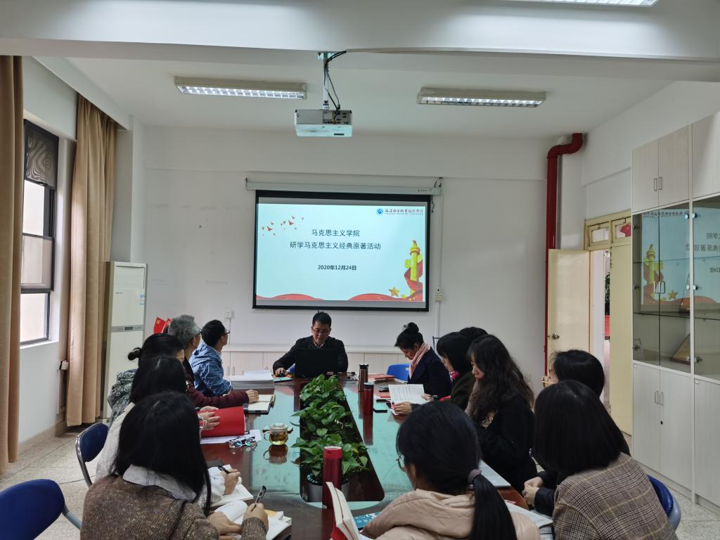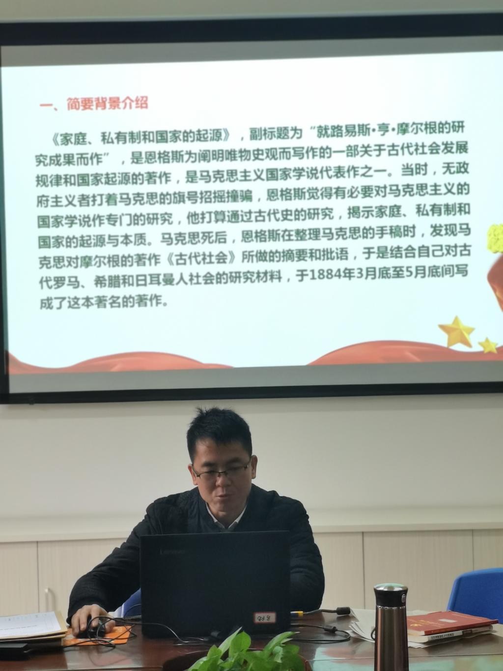 2020年12月24日上午,马克思主义学院全体思政教师在会议室举行了第十一次马克思主义经典原著研学活动,此次活动由马克思主义学院院长熊美兰主持,江洪老师主讲,研学内容为恩格斯的《家庭、私有制和国家的起源》。