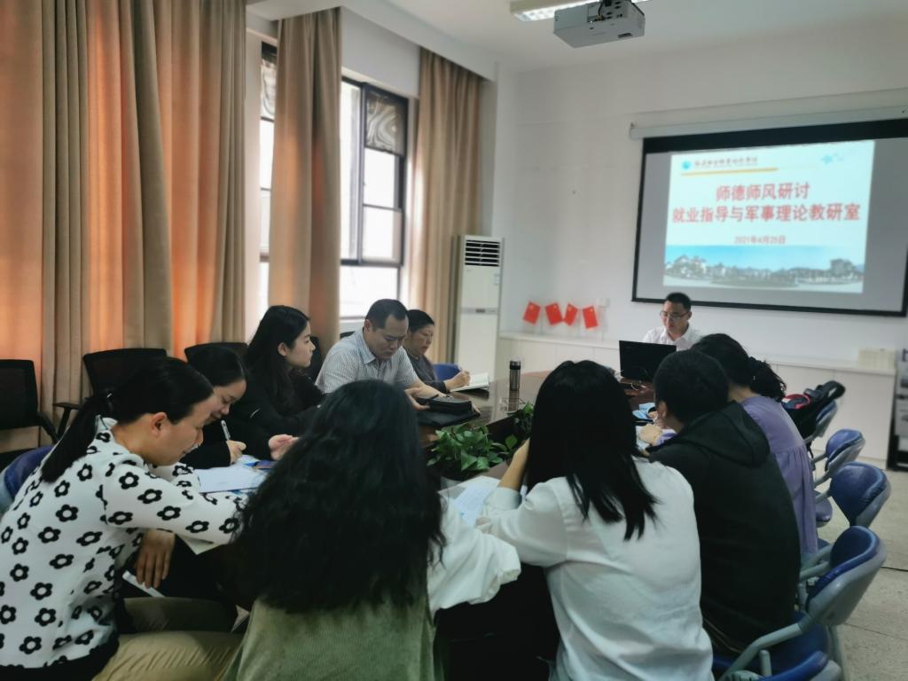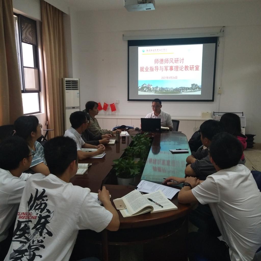 为深入贯彻党的十九大精神,全面加强教师队伍师德师风建设,同时更好贯彻落实马克思主义学院关于师德师风建设会议精神,2021年4月26日,就业指导与军事理论教研室在马院会议室开展“树师德正师风”师德师风研讨交流活动。