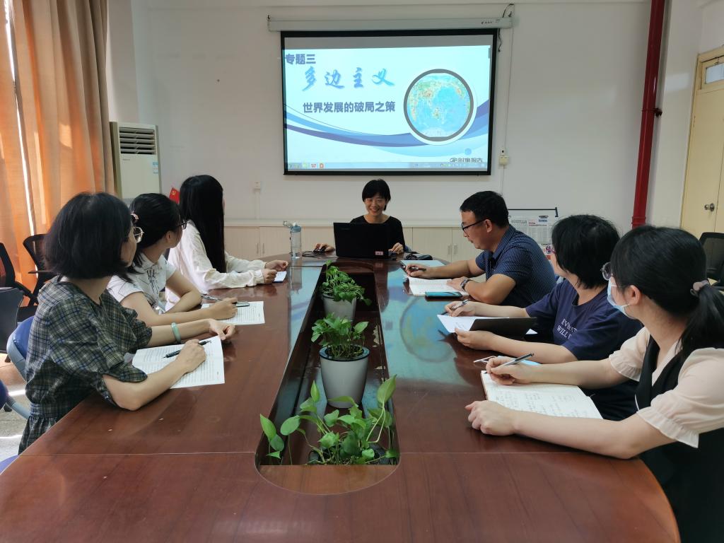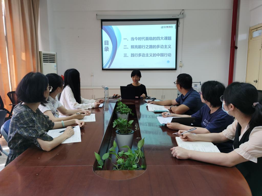 本次会议由形势与政策课教研室主任郑冰主持,并由郑冰进行专题三“多边主义:世界发展的破局之策”示范教学。她结合国内外时事热点和详实的案例、数据,从当今时代面临的四大课题、照亮前行之路的多边主义、践行多边主义的中国行动三个方面进行了充分的备课。