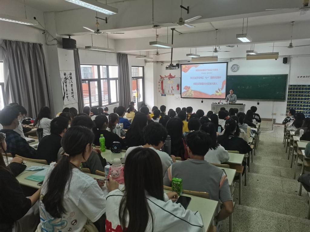 2021年10月18日上午,马克思主义学院教师张茵珠在教学楼215教室为20药学301-302班结对班级学生作《学习习近平总书记“七一”重要讲话精神 做堪当民族复兴大任的时代新人》专题宣讲。
