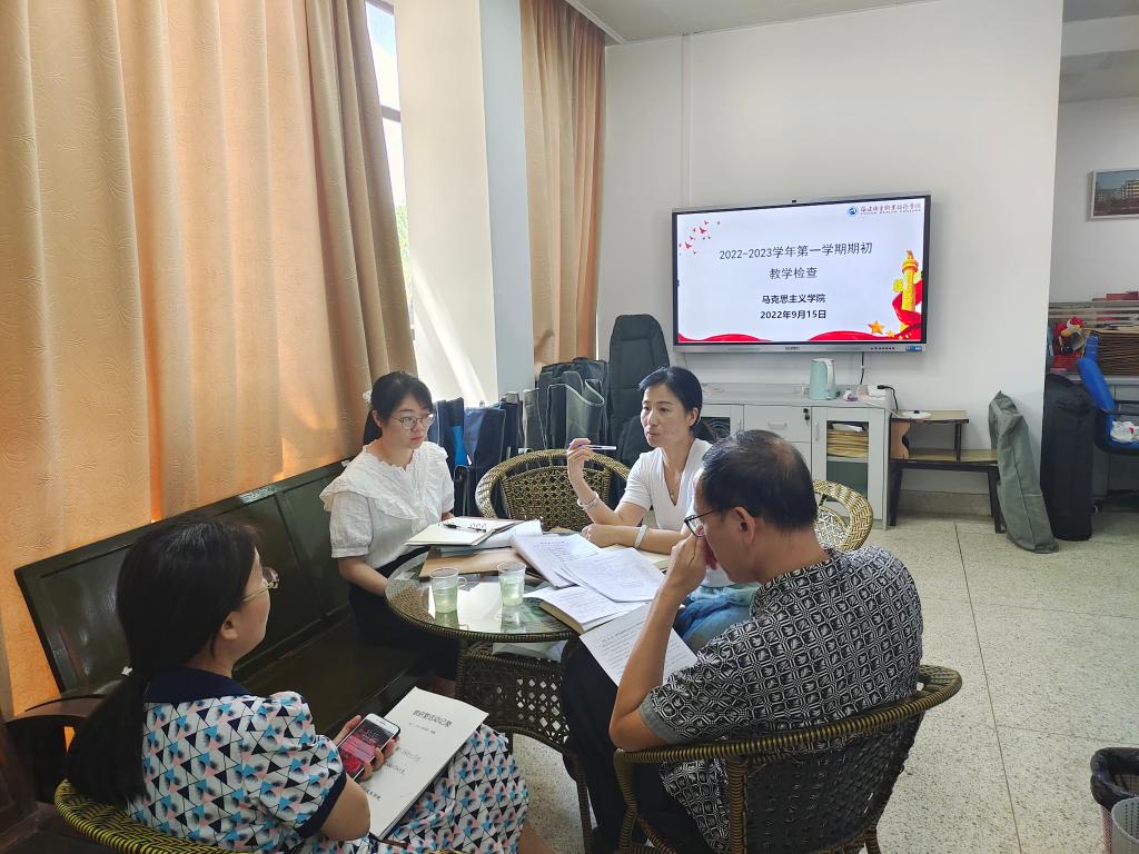 督导组就本学期教学督导计划、日常教学检查工作、定期教学检查工作、教学信息渠道、督导听课情况等工作进行了全面检查。对前期线上授课的教研室计划及活动安排表、教研室检查记录及教研室全体教师授课计划及进程表与开学前2周备课情况等材料出现的问题进行反馈。督导组对马院和各教研室的期初期末末教学准备情况整体上表示肯定,材料准备充分、较为详细,同时也对个别教研室教学材料的规范提出了很好的建设性意见,后续要不断完善材料。
