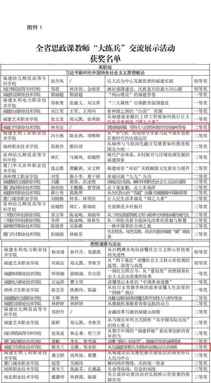 近日,《福建省教育厅关于公布全省思政课教师 “大练兵”交流展示活动评选结果的通知》文件公布,我校马克思主义学院教师在活动中表现突出,荣获二等奖1项、三等奖1项。