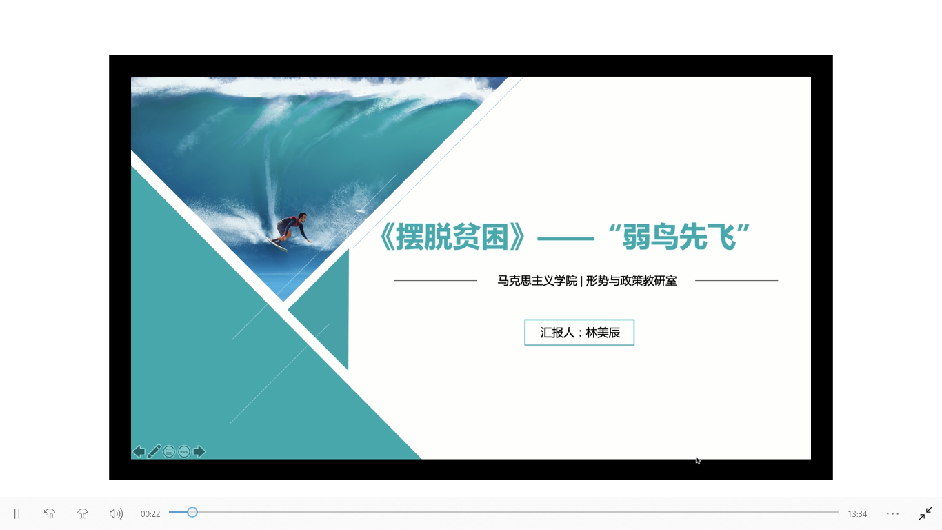 活动中,林美辰首先为我们介绍了《弱鸟如何先飞》这篇文章的背景介绍。这篇调查随感,是习近平担任宁德地委书记期间,协同地区几位领导同志调研了闽东九县,比较系统地阐述了如何认识贫困地区发展、贫困地区如何发展两大问题。接着,她从该文章架构与导向、主要内容等方面进行研读。其中包括“先飞”意识--直面问题;关于飞洋过海的艺术--解决策略;怎样丰满羽翼--实施的途径。最后,她为我们分享了启示。她说道,作为思政课教师,更应该学习“弱鸟先飞”坚持问题导向和调查研究,凸显辩证观点。在教学与教研的过程中,更多地解放思想、推进实践,努力提升自身教学能力与水平,实现顺利地开展工作。