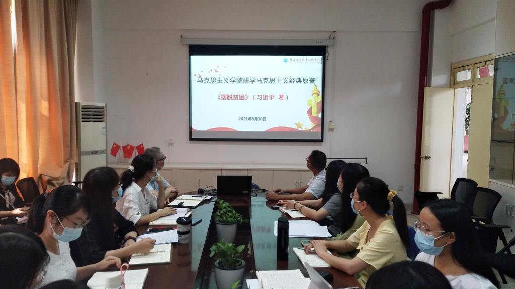 2021年9月30日上午,直属马克思主义学院党支部在会议室107举行了马克思主义经典原著研学活动,此次活动由党支部书记熊美兰主持,林美辰同志线上主讲,研学内容为习近平总书记《摆脱贫困》一书中的文章《弱鸟如何先飞》。