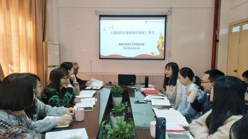 为切实增强我校师生国家安全保密意识,维护国家安全和利益,2021年11月11日,直属马克思主义学院党支部召开中心组保密知识专题学习(扩大)会议,组织支部全体党员教师学习《高校师生保密知识读本》,会议由直属马克思主义学院党支部书记熊美兰主持。