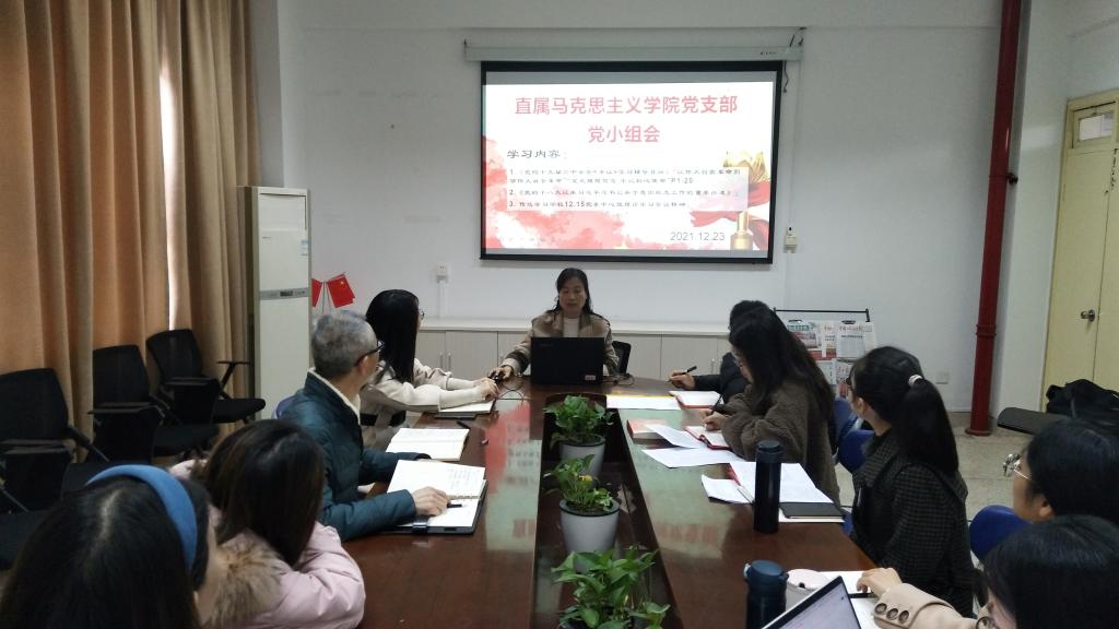 2021年12月23日,直属马克思主义学院党支部第二党小组在会议室107开展理论学习,学习《党的十九届六中全会<决议>学习辅导百问》、党的十八大以来习近平总书记关于意识形态工作的重要论述、我校党委理论学习中心组会议精神等内容。学习活动由来朋珍同志主持。