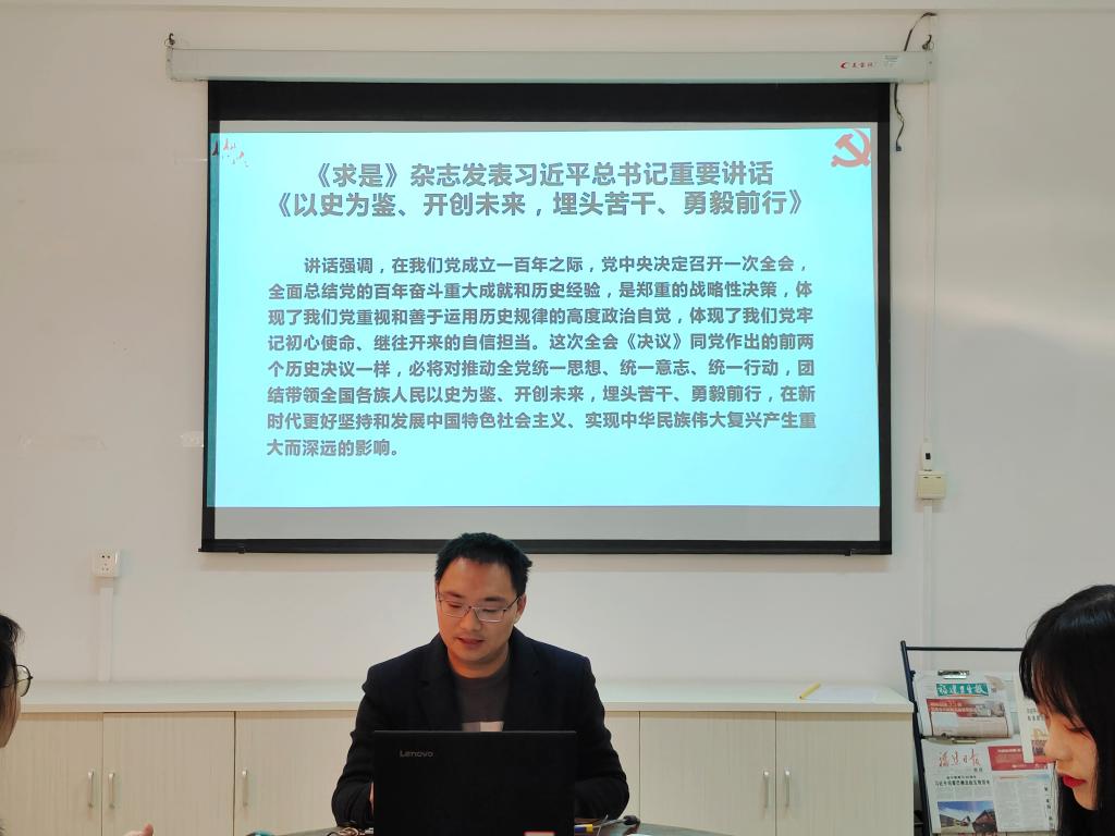 张崇飞同志分享了学习《求是》杂志发表习近平总书记《以史为鉴、开创未来,埋头苦干、勇毅前行》(在党的十九届六中全会第二次全体会议上的重要讲话)的心得体会。他强调,全体党员教师应当坚定历史自信,坚持自我革命,发扬斗争精神,争做四有好老师。
