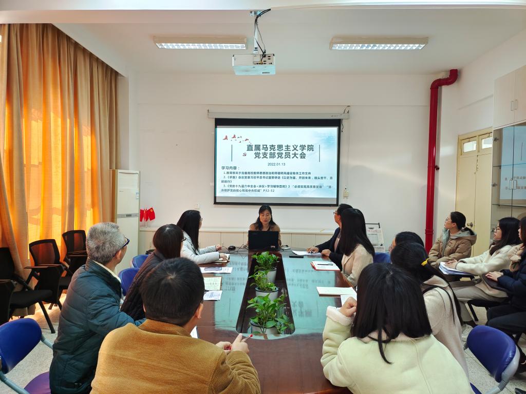 2022年1月13日上午,直属马克思主义学院党支部在107会议室召开中心组学习(扩大)会议,学习《教育部关于完善高校教师思想政治和师德师风建设有关工作文件》《求是》杂志发表习近平总书记重要讲话《以史为鉴、开创未来,埋头苦干、勇毅前行》《党的十九届六中全会<决议>学习辅导百问》等内容。本次会议由直属马克思主义学院党支部副书记来朋珍主持,全体党员教师参加。