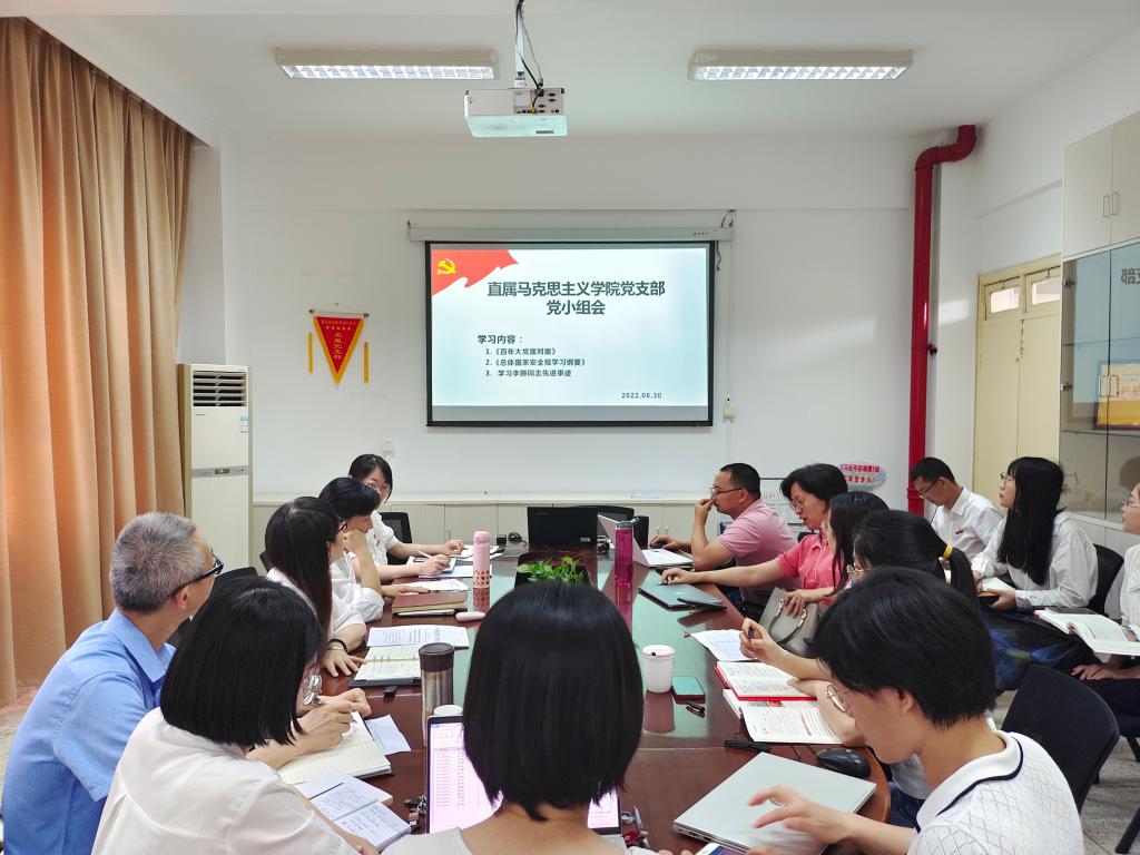 2022年6月30日,直属马克思主义学院党支部第二党小组在会议室107进行理论学习,主要学习《百年大党面对面》《总体国家安全观学习纲要》、李翀同志先进事迹,学习活动由党小组来朋珍同志主持。