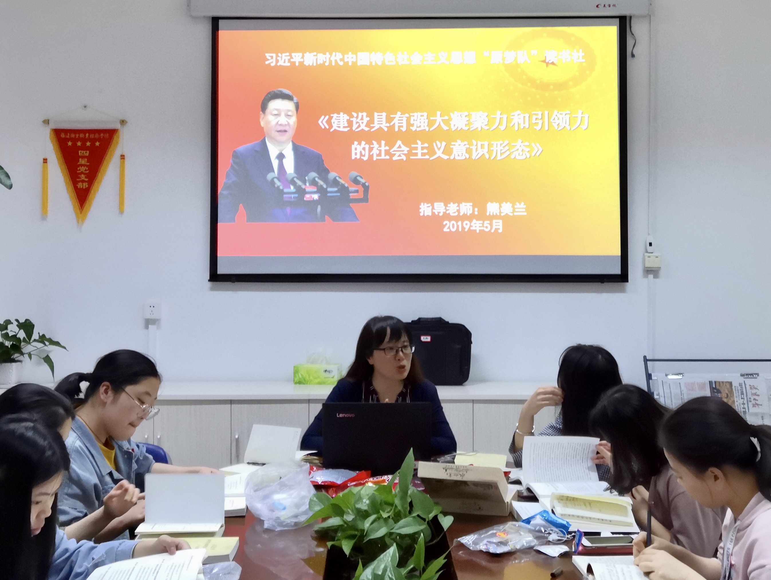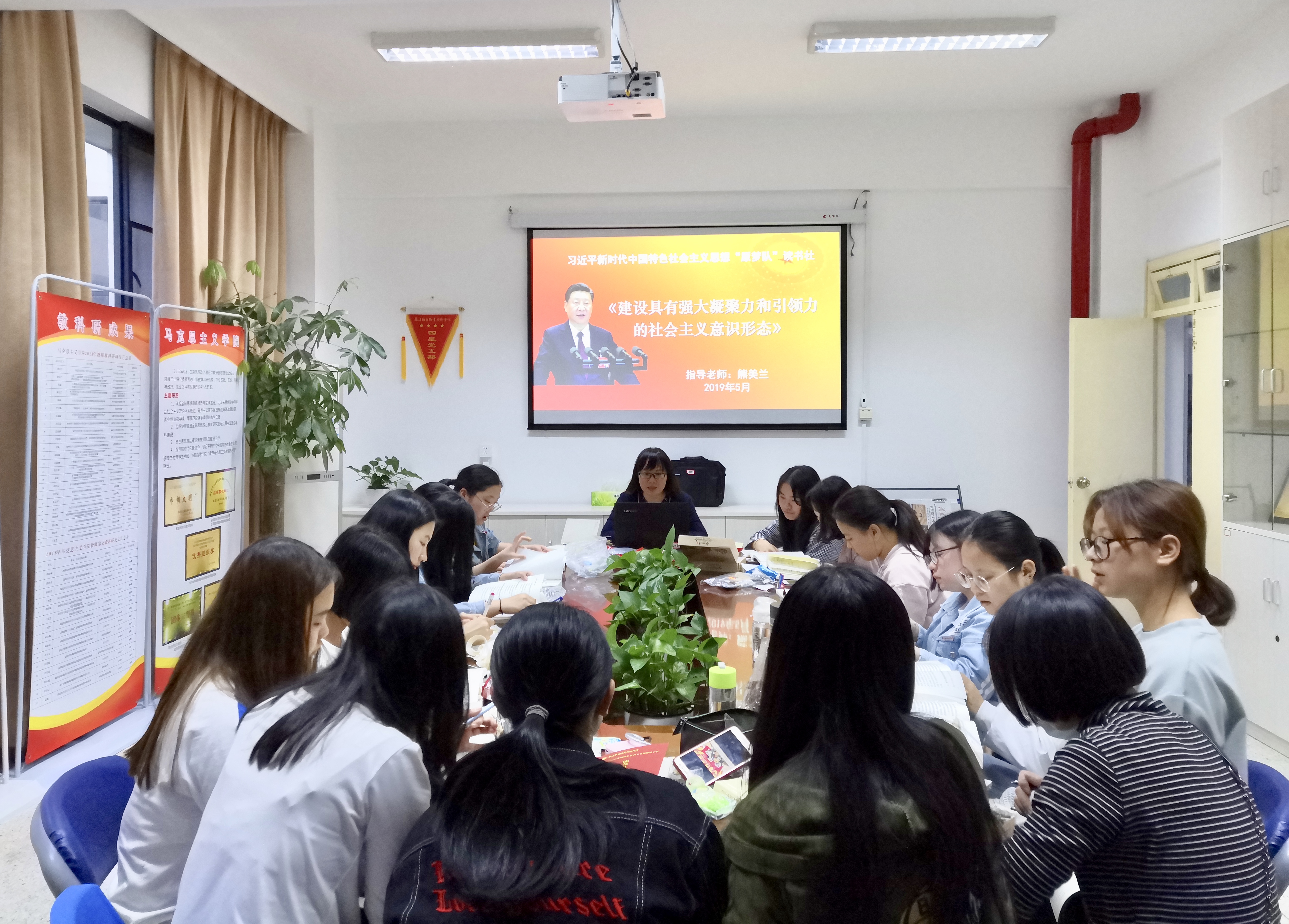 为学习贯彻《习近平新时代中国特色社会主义思想三十讲》第十九讲之牢牢掌握意识形态工作领导权及坚决打赢网络意识形态斗争的精神,我院习近平新时代中国特色社会主义思想读书社原梦队,于2019年5月7日18:30,在马院研讨室召开了专题学习会,由马院院长、指导老师熊美兰主讲。