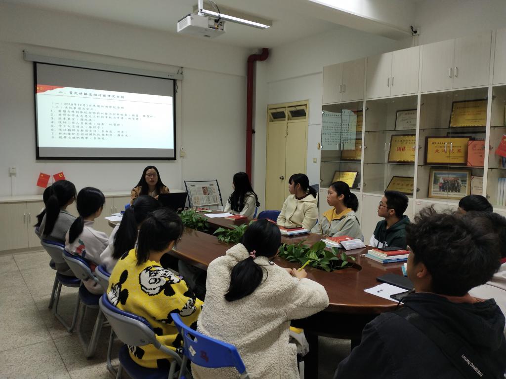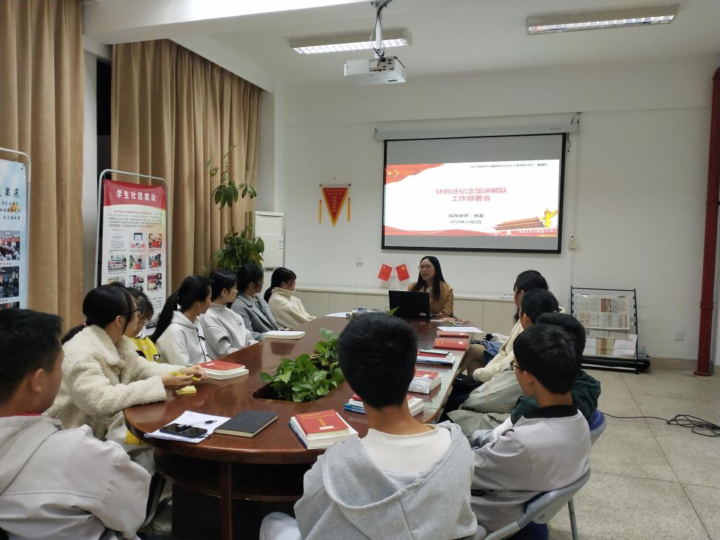 2019年11月2日,在马克思主义学院的组织下,习近平新时代中国特色社会主义大学生宣讲暨三馆志愿讲解队成立大会召开。根据讲解队的工作要求,12月2日林则徐纪念馆讲解队召开了工作部署会议。此次部署会议由讲解队指导老师杨盈主持,七位讲解队员和读书社星星队的成员们参加了此次会议。