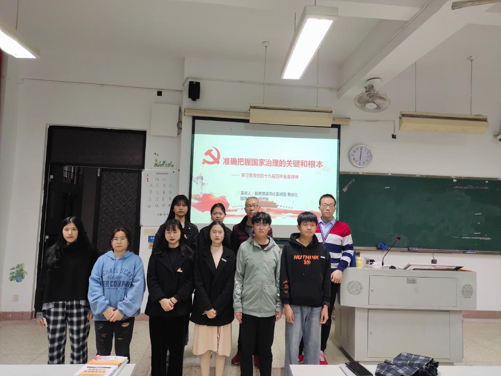 活动开始,由胡济林老师向大家简要介绍马克思主义学院新成立的习近平新时代中国特色社会主义思想读书社宣讲团的职责和使命,并欢迎同学报名参加。接着,胡老师说最近一段时期党和国家政治生活中的一件大事是,中国共产党胜利召开十九届四中全会,审议通过了《中共中央关于坚持和完善中国特色社会主义制度、推进国家治理体系和治理能力现代化若干重大问题的决定》。胡老师指出,中国特色社会主义制度是具有鲜明中国特色、显著制度优势、强大自我完善能力的先进制度,为中华民族迎来从站起来、富起来到强起来的伟大飞跃提供了根本制度保证。那么,如何将中国特色社会主义制度的巨大优越性转化为成熟而完善的治国理政的具体体制、机制和措施,使我们的制度更加巩固、更加持久则是党的十九届四中全会研究的重要内容。然后,胡老师邀请新思想读书社宣讲团黄幼红同学作了党的十九届四中全会精神的宣讲,她宣讲的题目是:准确把握国家治理的关键和根本。黄幼红同学在宣讲中,既梳理了她学习党的十九届四中全会精神的心得体会,又列举新中国成立70年来特别是改革开放40多年来一系列辉煌成就,加深同学们对中国共产党的领导是中国特色社会主义最本质的特征、对始终坚持党的集中统一领导的认识,黄幼红同学说,我国社会主义政治制度优越性的一个突出特点是党发挥总揽全局、协调各方的领导核心作用,形象地说是“众星捧月”,这个“月”就是中国共产党。黄幼红同学号召同学们把党的十九届四中全会精神学习好、领会好、贯彻好,学以致用,为实现中华民族伟大复兴作出应有的贡献。