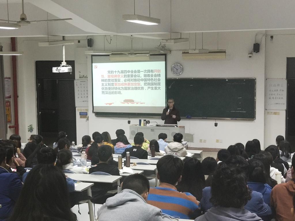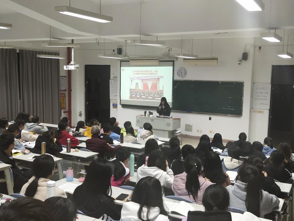 2019年12月30日傍晚,习近平新时代中国特色社会主义思想读书社宣讲团在教学楼209为19影像301-303班级开展学习贯彻党的十九届四中全会精神宣讲活动,这是本学期宣讲团第二场宣讲活动。