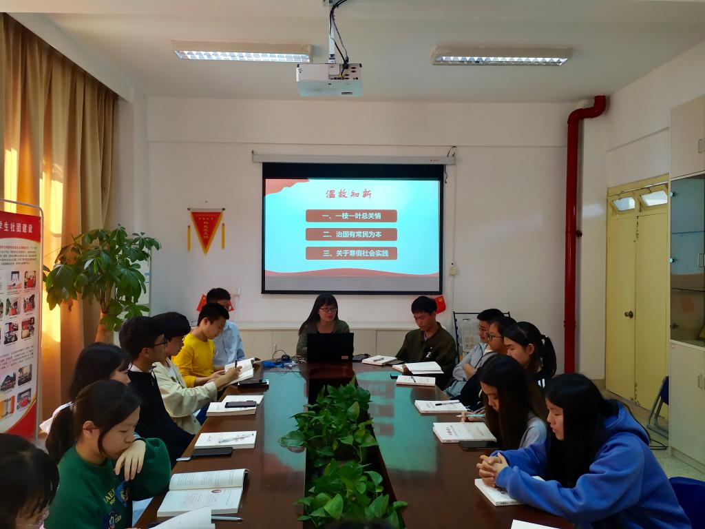 在本次学习中,熊美兰老师对前几次的学习进行了总结,对前两个专题的习近平总书记经典用语进行整理,从传统文化讲到治国之本;从文化兴国讲到以民为本;从“文化兴国运兴,文化强民族强。没有高度的文化自信,没有文化的繁荣兴盛,就没有中华民族伟大复兴”,讲到“人民利益高于一切,人民所向往的就是共产党的奋斗目标”。讲解之后,老师对我们进行了考查,通过三篇古诗能够了解到同学对内容的理解。温故而知新,从本次的总结中,我们又可以学到很多知识。而后,熊美兰老师组织讨论了下学期的社团计划以及寒假学习和实践任务。