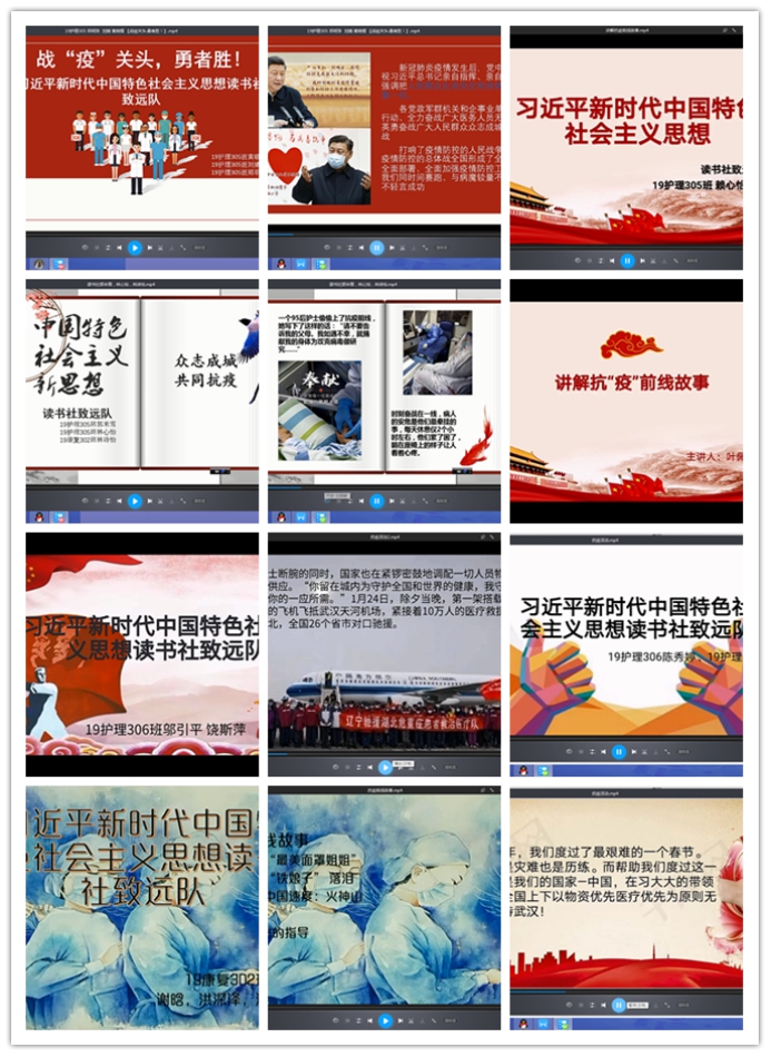 社团成员自愿组队,2-3人为一组,最后形成了6个组。每组通过收集整理资料、制作PPT、录屏等环节,经过近2个星期的精心准备,最后产生了6组作品。黄晓樱、刘婧、郑明珠同学的作品介绍了新冠肺炎及其防治,介绍了习近平总书记给出的“最强攻略”:坚定信心,同舟共济,科学防治,精准施策!郭米雪、林心怡、林诗怡同学的作品先是赞美了钟南山院士等抗战在一线的医护人员的伟大,再介绍了习近平总书记对抗击疫情工作的关心和支持。谢晗、洪深泽、温雨洁同学的作品介绍了“最美面罩姐姐”喻银燕、十天建成火神山医院等故事,以及表达了习近平总书记指挥抗疫的信心与决心。叶佩琪、林羽晴、赖心怡同学的作品表达了自己对前线抗战疫情的一线人员的感激与敬佩之情,希望春暖花开,国泰民安!陈秀婷、魏晓雯同学介绍了疫情发生的主要时间点和党的领导。邬引平、饶斯萍同学介绍了首批医疗救援队签下请战书奔赴湖北,全国各地为武汉送救助物资的感人故事!