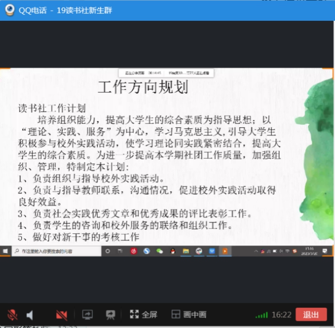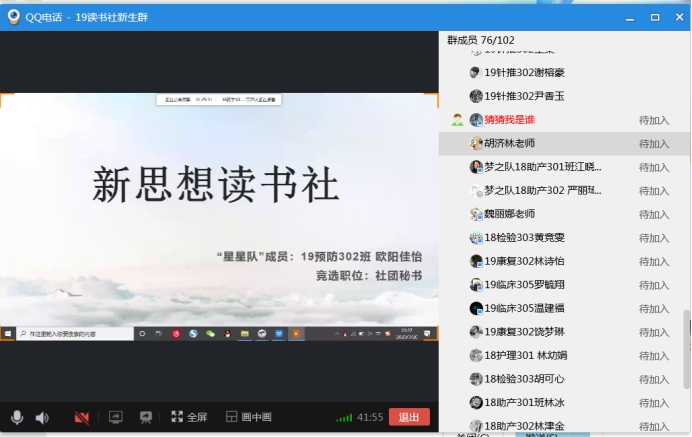大会在新思想读书社社长雷榕芳主持下拉开了帷幕,以网络平台为会场,分为社团工作汇报和换届改选两大议程。首先,由雷榕芳社长代表读书社对读书社工作进行了汇报,对过去一年的社团工作进行回顾,同时提出了存在的不足及未来努力的方向,希望新一届读书社干事能够在其位、谋其政、担其责,团结一致,携手合作,把读书社越办越好,为新时代青年学子创设新思想学习和淬炼的学生平台。随后,读书社全体成员一致表决通过了社团工作报告。