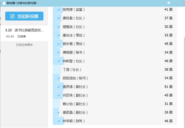 接下来,来自读书社5个分队共14名社团成员依次参与竞选,他们边展示精心准备的PPT,边侃侃而谈,畅述自身对社团的认知、对竞选岗位的性格和能力的储备,展望社团工作的未来规划。在每位竞选演讲后,在场的社团成员和指导老师与竞选者即时进行互动提问与回答。在相互交流环节中,选举人与候选人进一步加深了了解,会场气氛严肃而不失热烈活跃,促进了大家对社团性质的理解和对未来发展的美好期许。之后,以无记名投票方式,每个人在QQ群投票平台投下了神圣而庄重的选票,以票数选出了新一届的读书社干事人选。他们分别是:林新智、陈秀婷、谢贤涛、赖心怡、廖冰冰、黄晓樱、郭米雪、廖佳盈、蔡雅岚、欧阳佳怡、何艺伟、丁滢和林学颖(排名不分先后)。