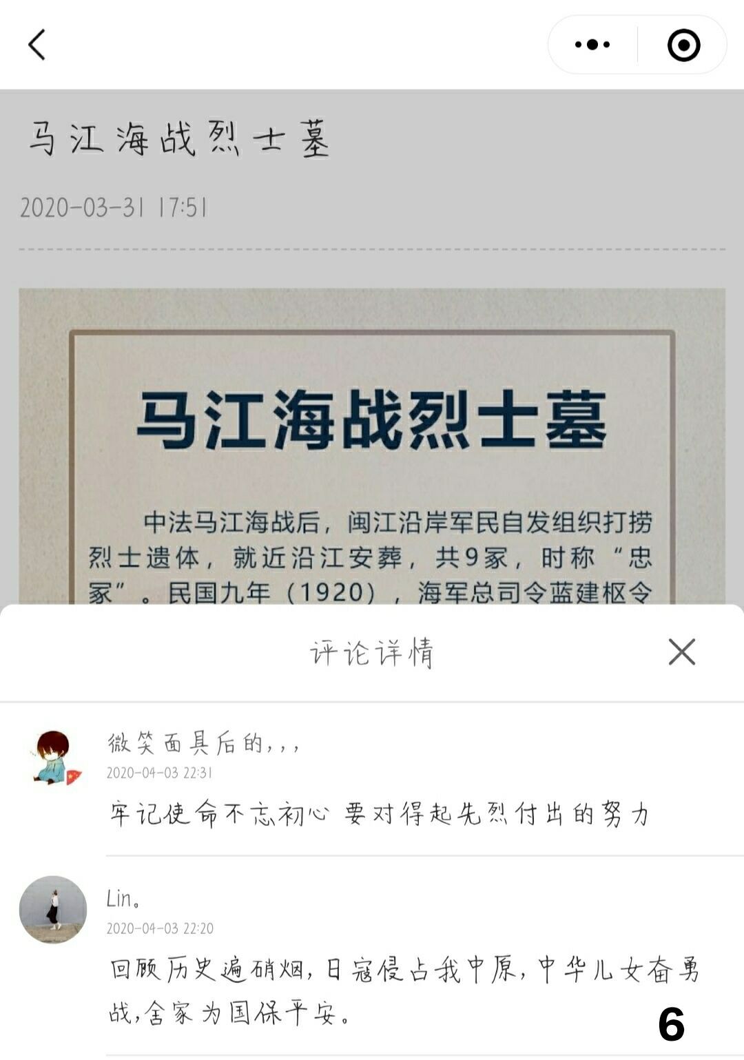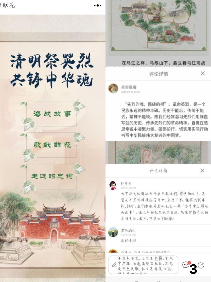 中华民族是崇尚英雄、成就英雄、英雄辈出的民族,和平年代同样需要英雄情怀。莺飞草长,临近清明,在新冠肺炎疫情防控的特殊时期,尚未返校开学的我们以网上祭扫方式缅怀革命先烈。2020年4月3日,我校中国船政文化博物馆讲解队在熊美兰老师的指导和林灵队长的带领下通过微信小程序向英烈献花,读海战故事,向为国捐躯的甲申、甲午海战英烈致敬!向为探索救国救民的道路、抵御侵略而牺牲的仁人志士致敬!