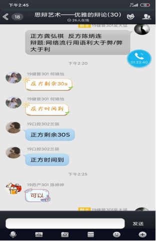 人在家中坐,切磋课中来。2020年5月12日演讲与辩论社团在“思辨艺术——优雅的辩论QQ群”如期举行一场别开生面的1v1辩论赛。本次的指导老师徐舒宁,选修课全体同学参加了此活动。