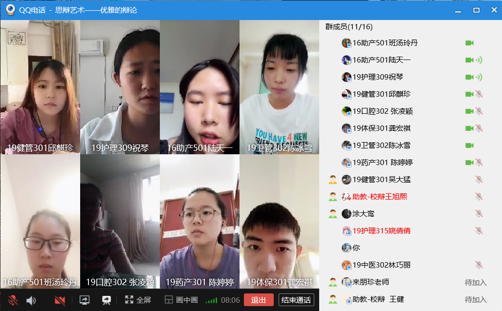 辩论场上你来我往,据理力辩共谈“医患”。2020年5月19日下午两点“思辩艺术一一优雅的辩论”QQ群线上开展了“如今中国面对伤医事件,医院是提供服务质量重要,还是提高安保能力重要”这一辩题的辩论。本次表演赛由演讲与辩论社长吴大猛主持,指导老师徐舒宁老师及选修课班级成员皆参加了此次活动。