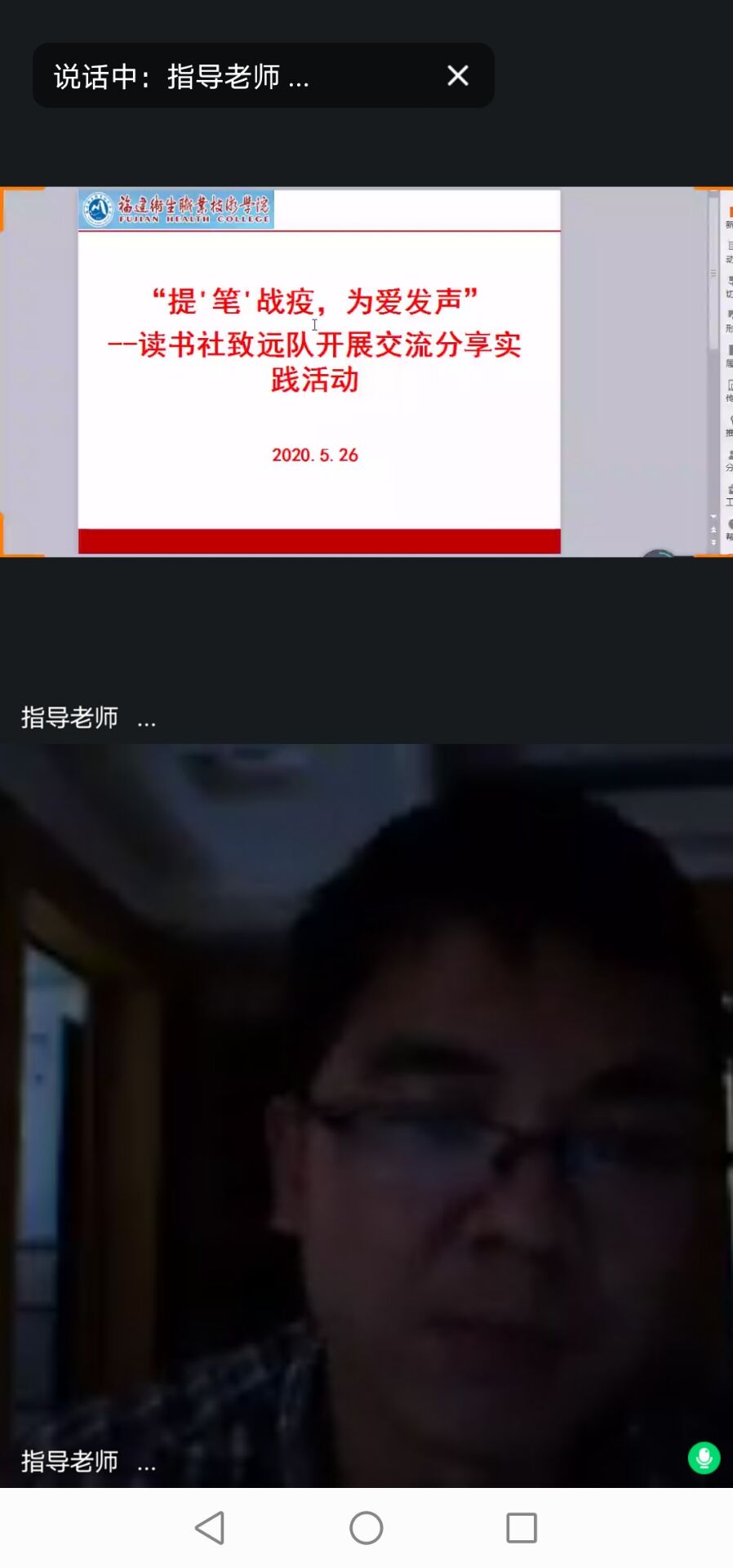 19康复302班林诗怡则分享了她父亲的故事。她的父亲是村里的副村长,在疫情最为严重的时候,每天冒着被感染的危险带领医生去给从武汉打工回来的老乡量体温,保证他们都能好好居家隔离。家人担心他,但他却说“这些事总要有人来做”。19护理305班赖心怡同学则是用一串串醒目的数据表达了抗击这场疫情的不易。