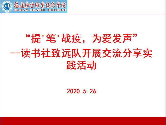 5月11日至5月25日,习近平新时代中国特色社会主义思想读书社致远队开展“提‘笔’战役,为爱发声”活动,社员们用文字记录中国抗疫故事,传播正能量,致敬“逆行者”,讴歌伟大的中国精神。5月26日下午,读书社致远队在QQ群开展交流分享实践活动。活动由指导老师江洪老师主持,所有社员参加了活动。