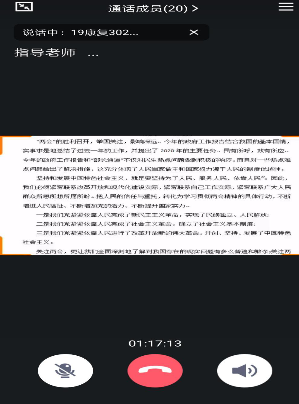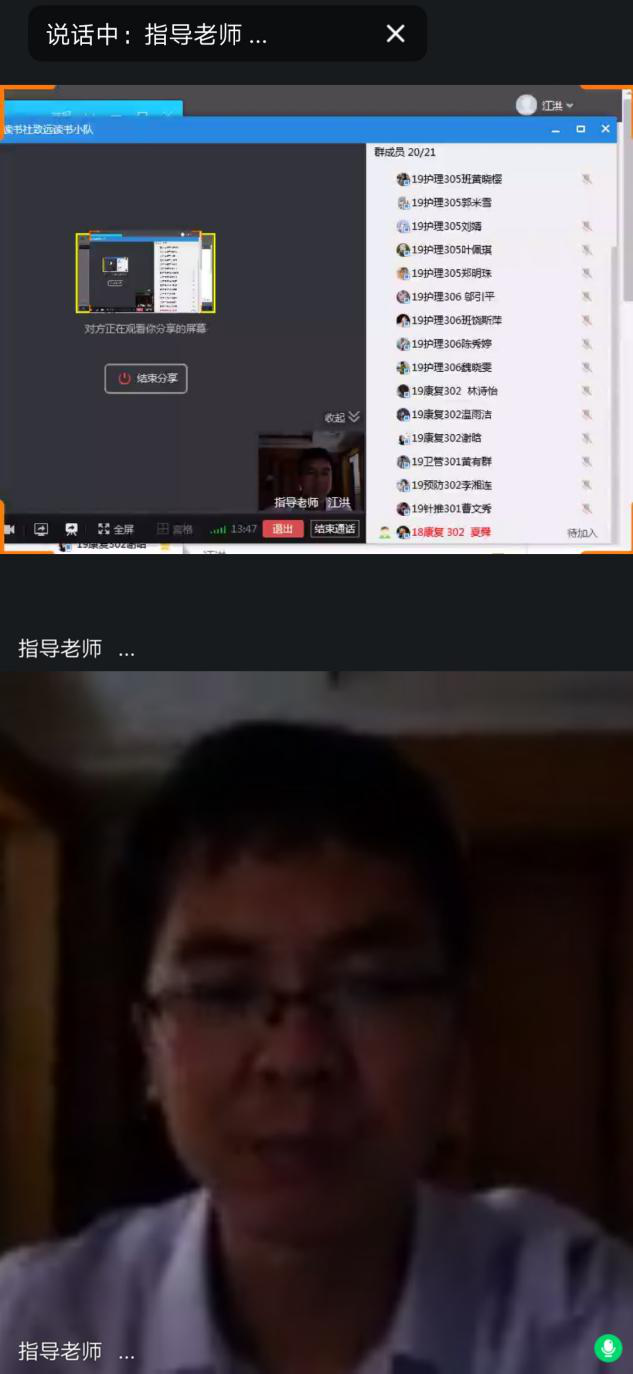 随后,成员们轮流依次发言,谈了学习2020年全国两会精神的心得体会。赖心怡同学提到了城乡发展的问题,并结合实际,谈了这几年自己所在村子的飞速发展;陈秀婷同学对李克强总理的政府工作报告主要内容进行了梳理,并从大学生的角度,谈到了大学生要关注国家大事,增强国家主人翁意识,增强担当民族复兴大任的使命感和责任感;洪深泽同学从今年中国抗击新冠肺炎疫情的重大事件出发,谈到了自己对“以人民为中心”的理解;林羽晴同学则讲到了今年的脱贫攻坚战,坚信我们可以如期全面建成小康社会;其他同学也就自己关注的问题展开了交流讨论。