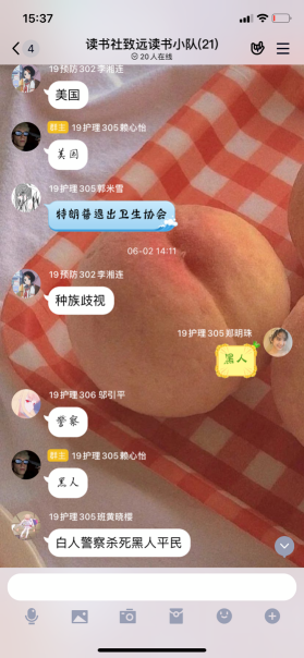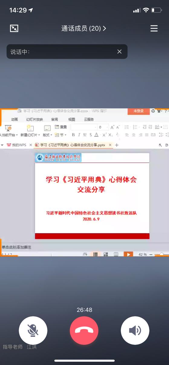 随后,各位社团成员逐个交流了自己本学期学习这门课程的学习心得。19护理305班魏晓樱说:“光阴似箭,这一学期也即将结束了。今年是个特殊的一年,因为新冠疫情的影响,学校虽然延期开学但开展了新的教学方式—线上教学。我们也以线上教学的方式学习完了《习近平用典》这门选修课。我也从中学习到了学到了修身养德的道理和感悟。”