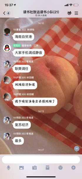 2020年6月9日下午,习近平新时代中国特色社会主义思想读书社致远队在QQ群开展学习《习近平用典》心得体会分享交流活动,这也是习近平新时代中国特色社会主义思想读书社社团选修课《习近平用典》的最后一课。读书社致远队成员全员准时到课参加学习,活动由指导老师江洪老师主持。