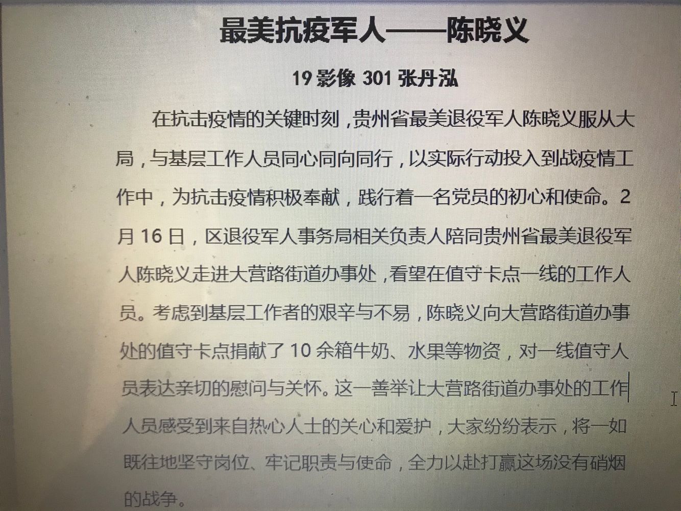 19护理301廖琳欣分享道:“当这场战役的集结号吹响时,曾经的退役军人也闻令而动,这是他们的本能,穿上军装,保家卫国;脱下军装,奉献社会。这种本能来自于曾经的那身军装,来自于永远不变的军魂。”19影像301张丹泓写道:“最美军人陈晓义始终保持着军人的特质,把荣誉、命令和责任牢记在心头、扛在肩上,用爱心与善心助力抗击新冠肺炎疫情,实实在在的贡献着自己的力量,完成党和人民赋予退役军人的时代重任。”社员们积极寻找最美军人事迹,表露自己最真实的心声。