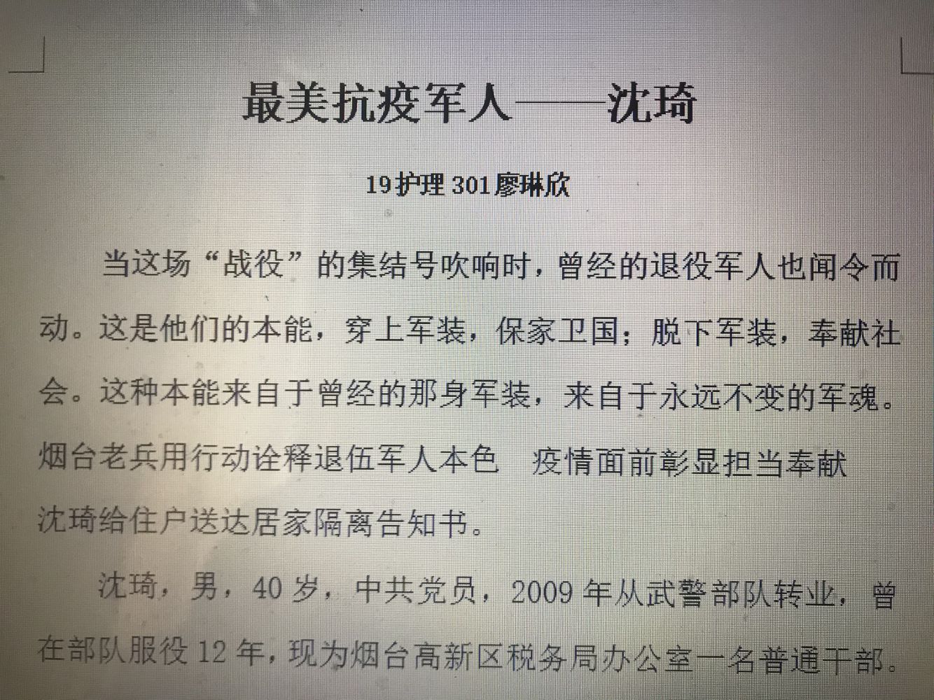 2020年注定是不平凡的一年,新冠病毒肆虐之际,整个武汉仿佛被按下了暂停键,在这场没有硝烟的战疫中,有一群逆行而上的英雄,他们身着迷彩衣服,日夜工作,到需要他们的地方去,维护社会秩序,帮助需要的人,我们赋予他们最美丽的名字“最美抗疫军人”。为弘扬军人冲锋在前的精神,树立军人先进品质的标杆,近期八一学社开展“追寻最美军人”抗疫故事征集活动,社员们积极参与,截至6月9日共收到30件优秀作品。