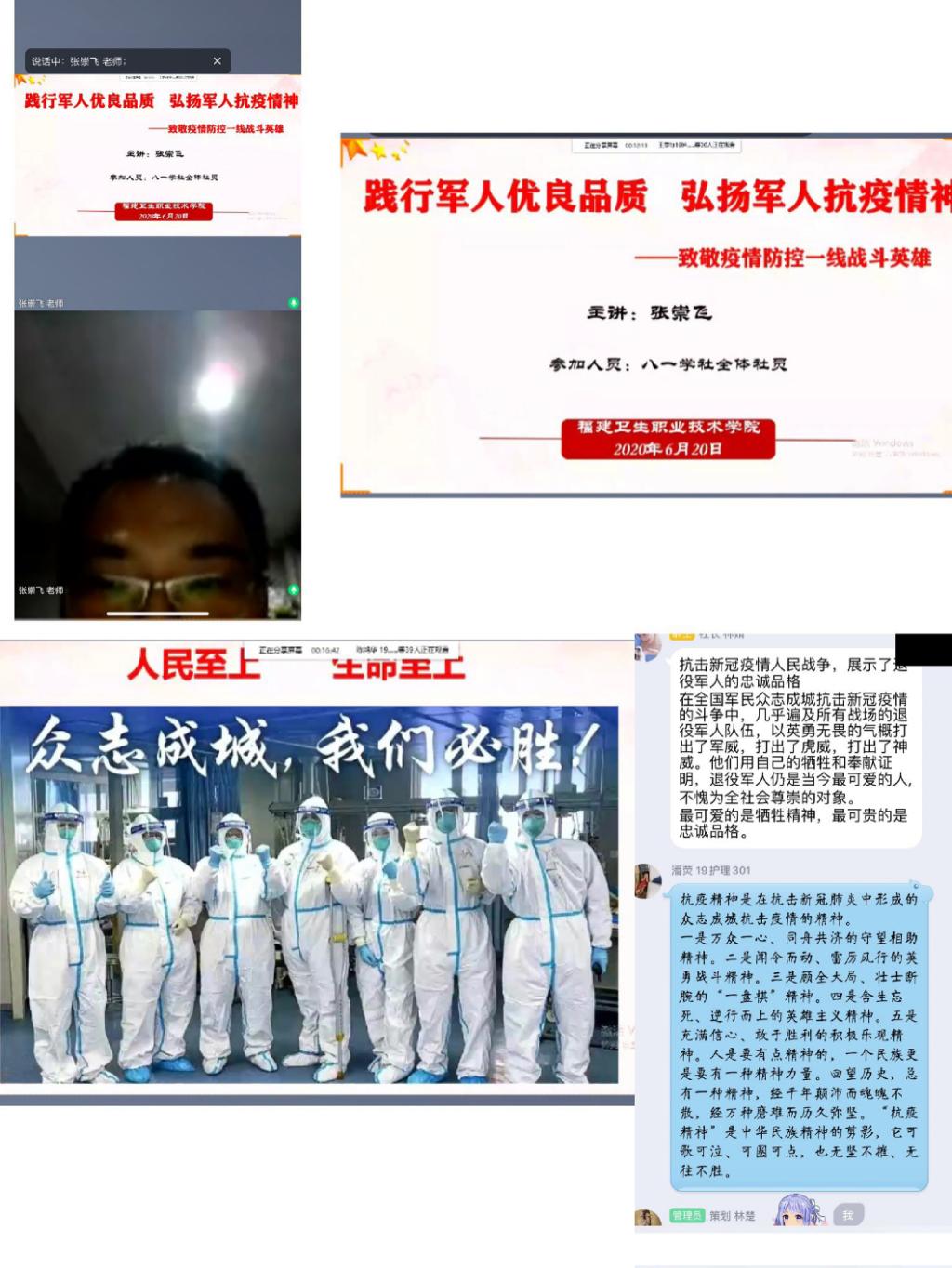 为了让八一学社社员更好地了解军人逆行抗疫一线情况,培养他们如何去践行军人优良品质、如何去弘扬军人抗疫精神,同时也丰富疫情期间他们的课余生活,2020年6月20日晚上8点,我社在线上举办“践行军人优良品质,弘扬军人抗疫精神”的讲座活动,讲座由张崇飞老师主讲,全体社员参加。