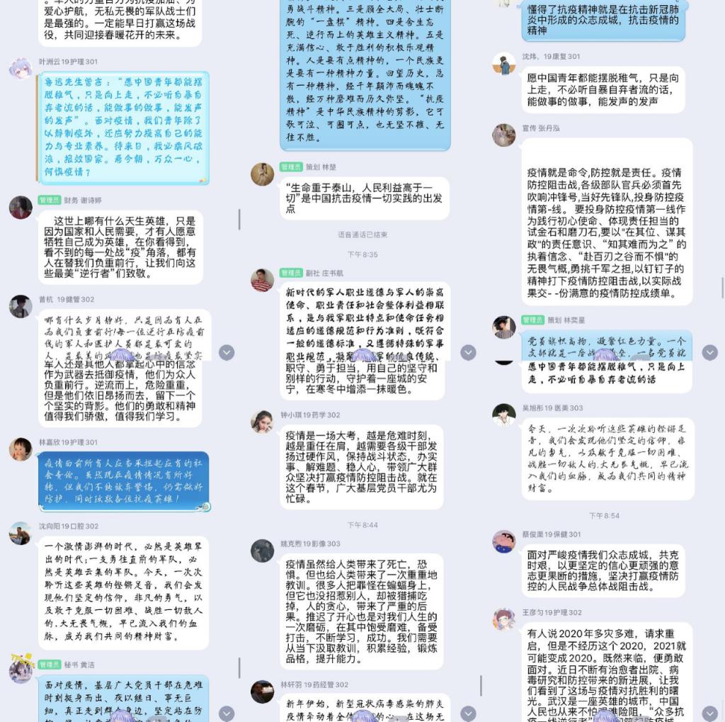 同学们在线上积极与老师频繁互动,听完讲座每位社员都有很多感想。2019级保健301班蔡俊渠分享到:“面对严峻疫情我们众志成城,共克时艰,以更坚定的信心更顽强的意志更果断的措施,坚决打赢疫情防控的人民战争总体战阻击战。”2019级医学美容303班吴旭彤发表感想说:“今天,一次次聆听这些英雄的铿锵足音,我们会发现他们坚定的信仰,非凡的勇气,以及敢于克服一切困难、战胜一切敌人的大无畏气概,早已流入我们的血脉,成为我们共同的精神财富。”最后,在“提灯女神”的歌曲中圆满结束了本次讲座。