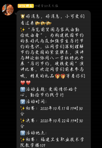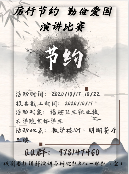 9月初,围绕“厉行节约,硬核爱国”这一主题,演讲与辩论社及八一学社全体成员,在来朋珍、徐舒宁、张崇飞及邱萍两个社团四位指导老师的带领下积极进行策划,面向学院全体学生以海报和宣传语进行宣传,经过精心的筹备与组织,共筛选出20部作品进入初赛环节。