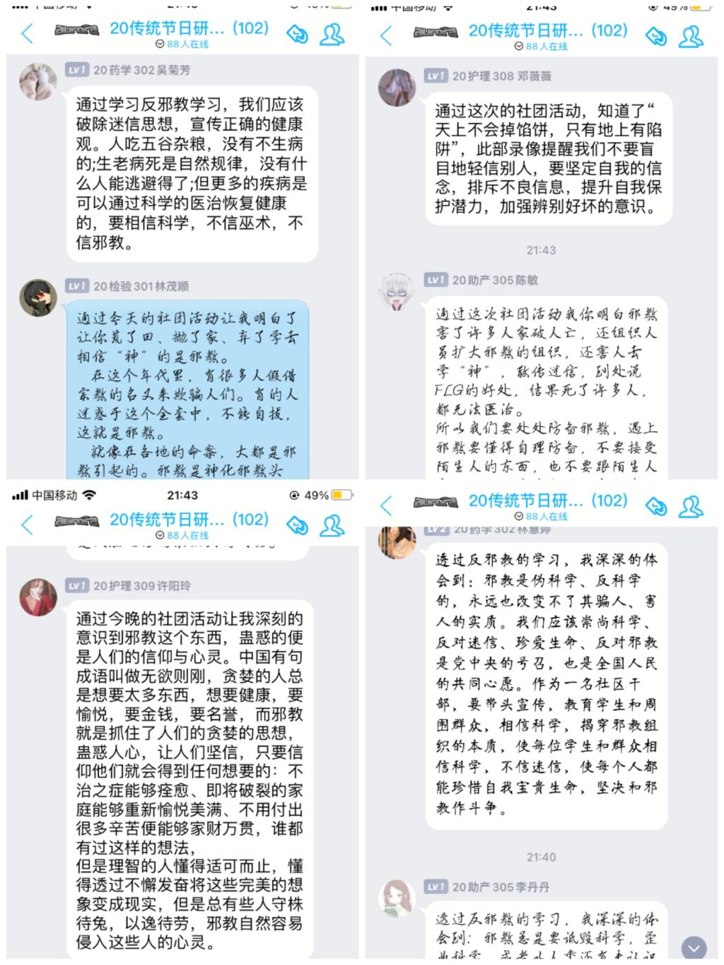 大会结束后,传统节日研习社成员在线上展开了热烈讨论,积极踊跃地发表了警示教育短片观后感,他们表示邪教是伪科学、反科学的,应该崇尚科学、反对迷信、反对邪教、珍爱生命,要坚定科学信念,努力学习科学知识,从科学的精神和态度把握生活,不断提高自身识别和防范邪教的能力。